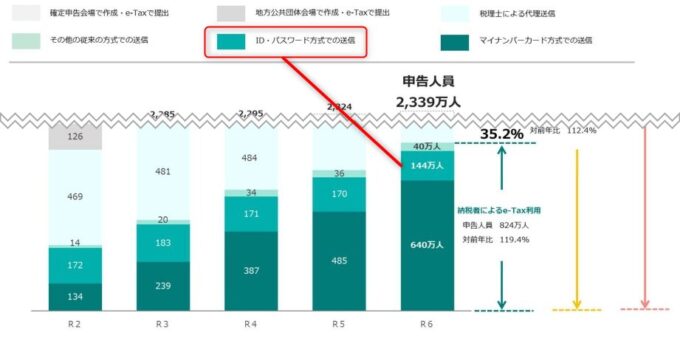 令和6年分の申告においては、申告人員2,339万人のうち、ID・パスワード方式の利用者は144万人でした。利用割合としては6%程度です。